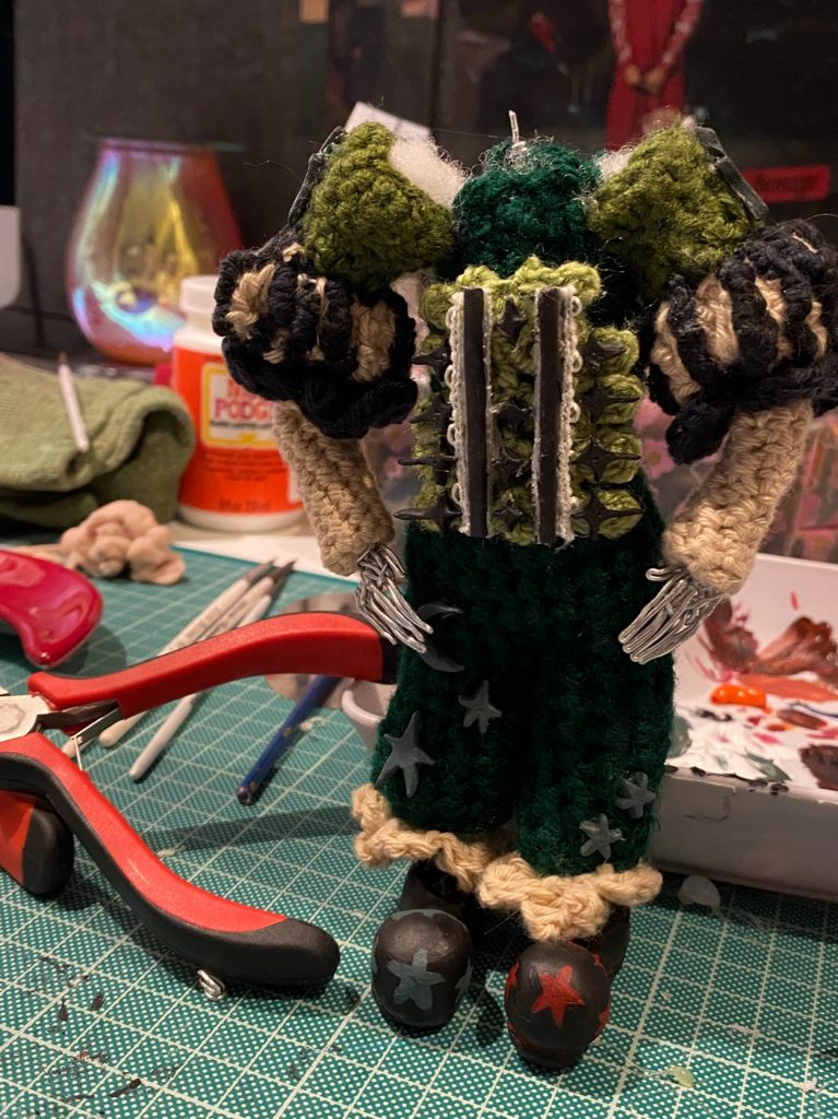 I made a material plan on procreate, so I had something to follow. I have made clothing for my stop motion puppets before, so I had an idea of how it would look and how to create each piece. However, the small details were something I was unsure about. I began crocheting and found it looked too flimsy and so I decided to make them with clay and paint them instead, using a hot glue gun to attach them. The clown collar is not exact to the plan either, it was a spontaneous choice that I ended up favouring more. At the end of summer, everyone moved out of university housing, and typically people will leave things they no longer want in the common room. This is where I found this ribbon and I tested to see if it was possible by folding the ribbon and hot gluing each section together. The experiment worked so well that I decided to use it on the final character design.